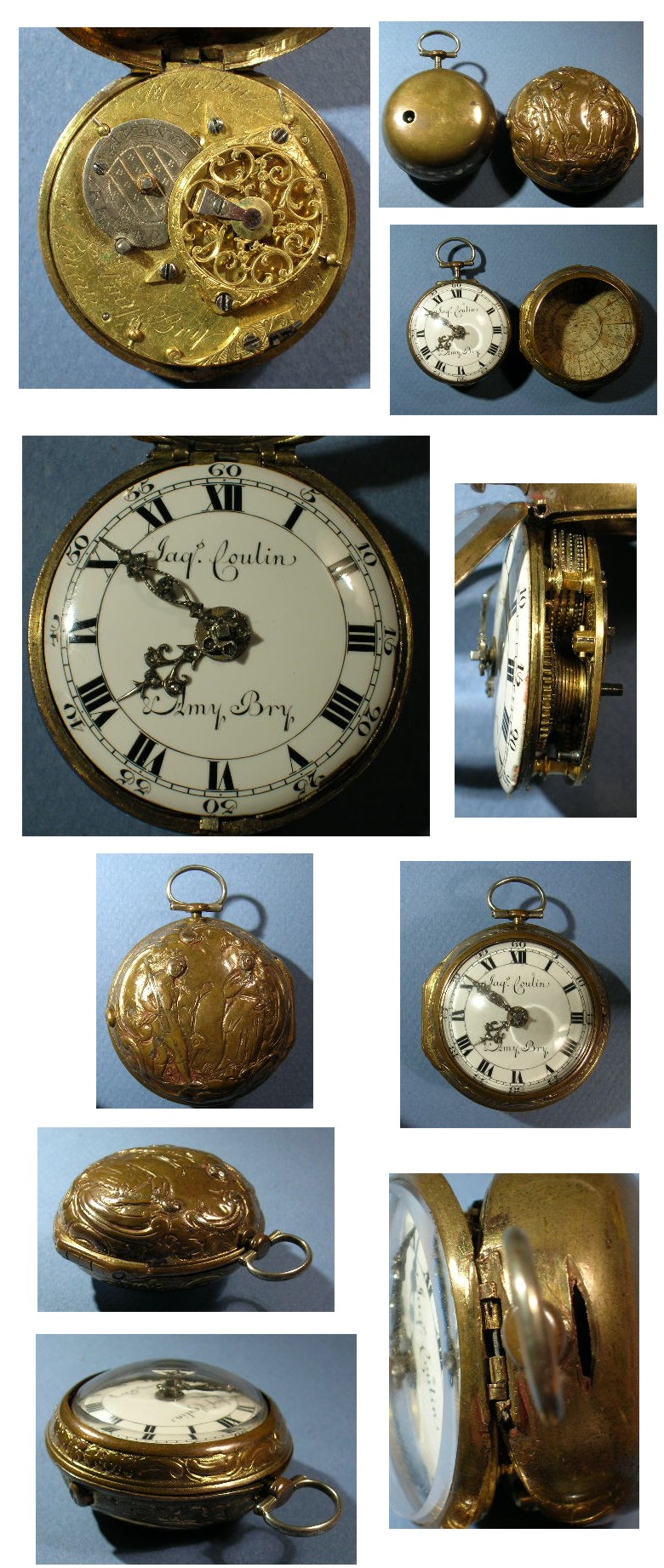 CONSTRUCTOR: Jaques Coulin & Amy Bry. FECHA: C. 1780. CAJA: Doble caja de cobre dorado al mercurio representando una escena con un cazador y una mujer. Toma de cuerda trasera. ESFERA: Esmalte blanco sobre cobre, numeración romana para las horas y árabe para los minutos. Agujas en plata con pequeñas piedras imitando diamantes. Firmada. MÁQUINA: Latón dorado de platina plena. Pilares cuadrangulares. (No 4591) Puente de volante calado y grabado con dos pies. Firmada Js Coulin & Amy Bry a Geneve. ESCAPE: Rueda catalina y regulador de esfera en plata. TAMAÑO: 4.9 cm. NOTAS: Durante el siglo XVIII los relojeros suizos suelen realizar sus obras siguiendo el modelo francés, galluza con dos puntos de fijación, toma de cuerda a través de la esfera y caja consular. En esta pieza, sin embargo se adopta la doble caja con bocallave posterior, típica de los relojes ingleses. ESTADO: Esfera. Muy bien. Máquina. Muy bien. Caja. Bien. El dorado a desaparecido prácticamente en su totalidad. Además alteraciones en la bisagra y un corte junto al pendant (ver fotos) indican que la caja podría no ser la original...(?) En cualquier caso se adapta perfectamente a la máquina coincidiendo con ella en forma, época y estilo. Estado de marcha.